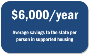 The cost is much higher to deliver behavioral health treatment in an institutional setting than in the community. Supported housing saves the state money by reducing days in a hospital or a nursing home and visits to the emergency room. Providing supportive housing to high-needs groups of homeless individuals with mental illness saves an average of $6,000 a year per person in health care costs, according to one study.[6] States that aim to help the highest need people can reinvest the health care and correctional systems savings into offering more rental assistance.