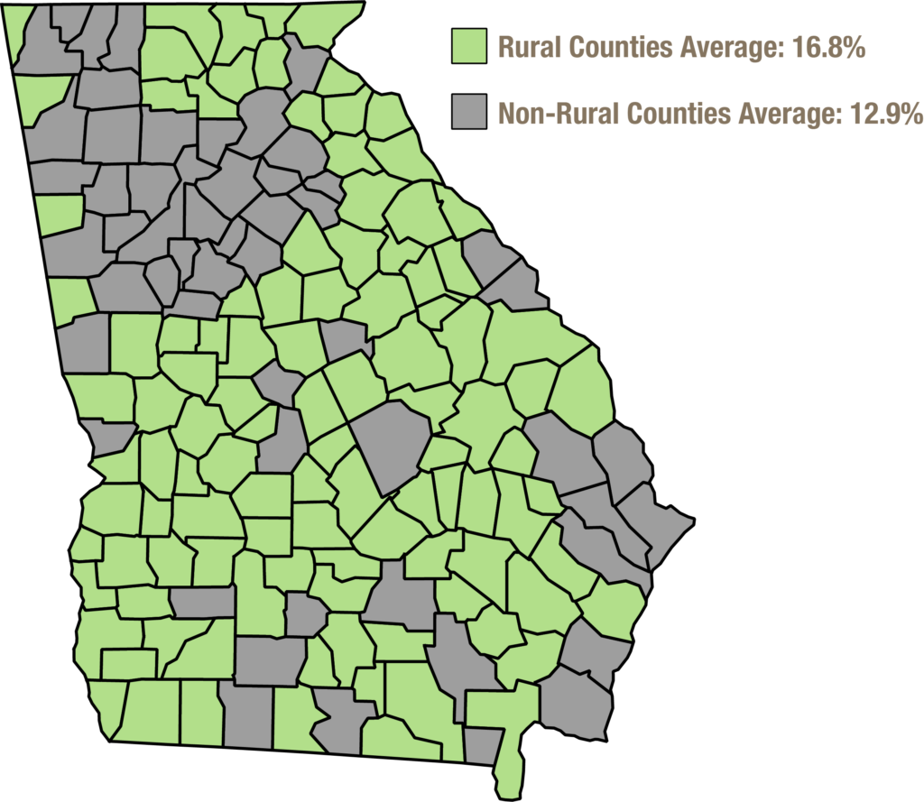Suicide deaths in Georgia increased 25 percent from 2012 to 2016. The rate of suicide death is much higher in rural Georgia. The suicide rate in rural Georgia counties was 16.8 percent in 2016 compared to 12.9 percent in non-rural counties.[12]