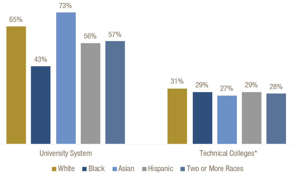 Black students face the highest barriers to graduation in the university system. In the technical college system, completion rates are lower but constant among racial and ethnic groups.[34] Low completion rates among lower-income and black students are made more worrisome as they become a larger share of higher education students.