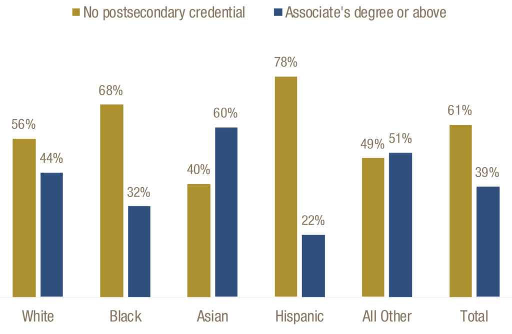 Large racial and ethnic disparities persist in postsecondary education achievement in Georgia. Hispanic Georgians are least likely to have an associate’s degree or higher. Fifty-six percent of white Georgians and 68 percent of black Georgians lack a postsecondary credential.[9]