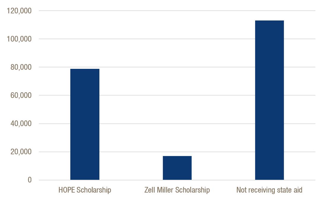Of the eligible bachelor’s and associate’s degree-seeking students in the university and technical college systems, 8 percent receive the Zell Miller Scholarship, 38 percent the HOPE scholarship, and 54 percent do not receive state aid through HOPE.[31]
