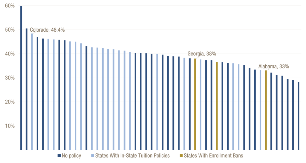 Georgia is one of only three states with policies that bar undocumented students from enrolling in certain colleges. The other two states are South Carolina and Alabama, which are home to smaller shares of undocumented students.