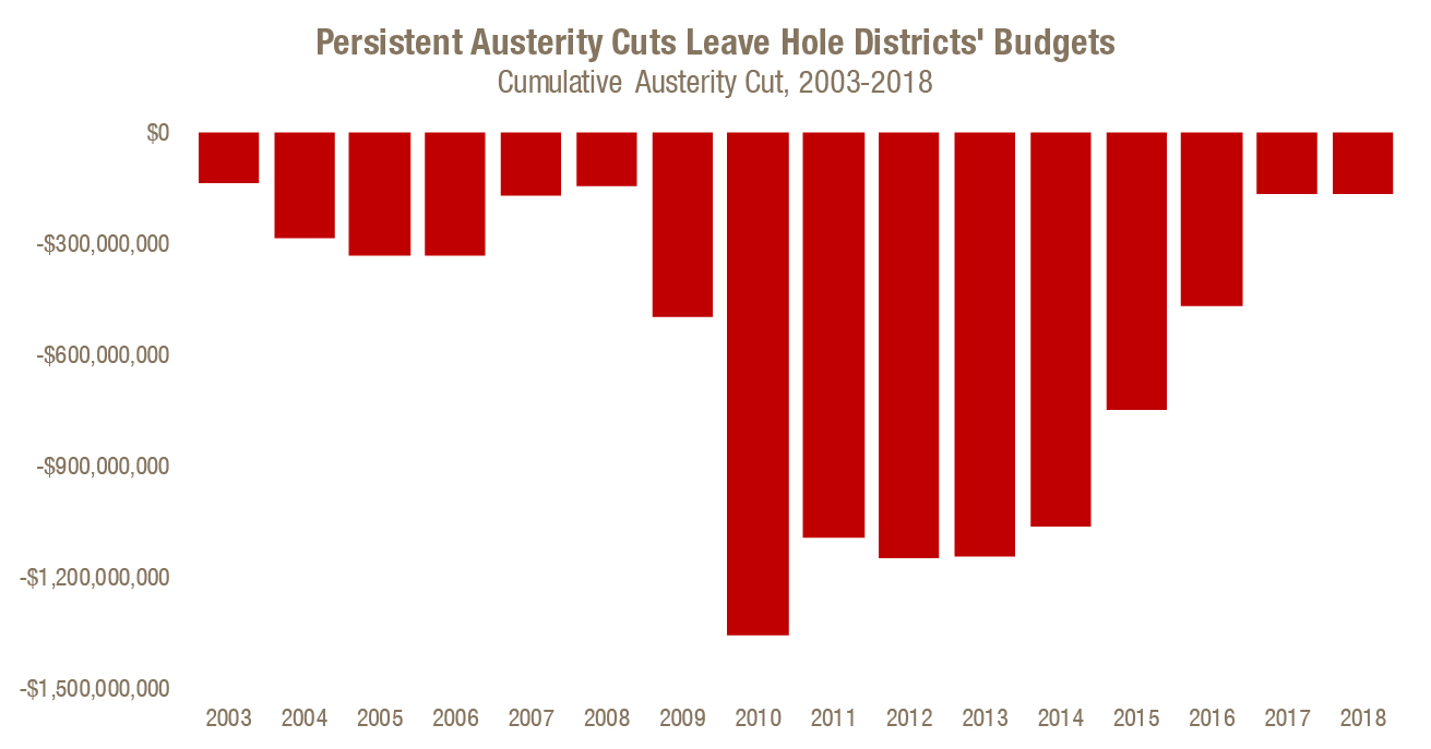 The General Assembly began restoring funds to shrink the austerity cut in the 2015 budget. By 2017 lawmakers added back $894 million. This enabled districts to begin restoring core services and reduced the austerity cut to $167 million in 2017. Lawmakers left it at this level in 2018.