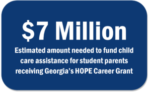 For about $7 million per year, Georgia can fund child care assistance for single parent students who receive the HOPE Career Grant.[1] This grant is available to students enrolled in selected majors identified as strategically important to the state’s growth.