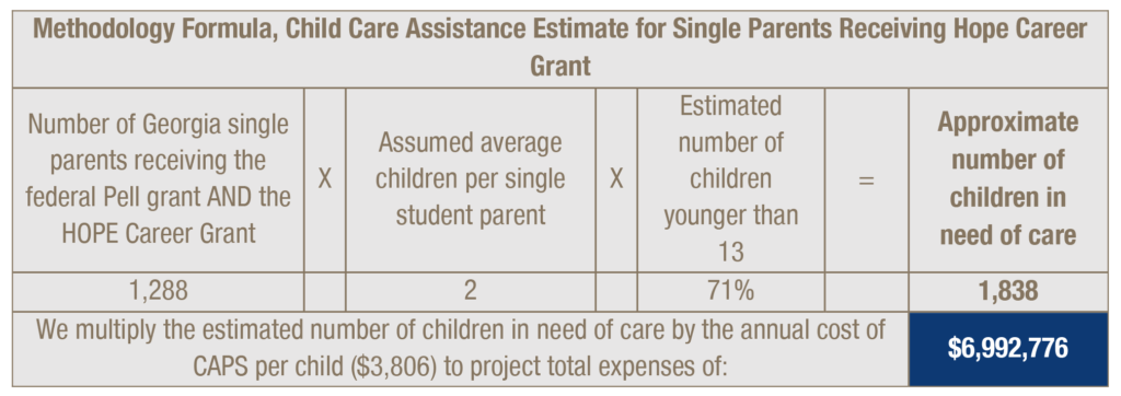 This analysis generates an estimate of how much money is needed to fund child care assistance for single parents receiving Georgia’s HOPE Career Grant programs by using the following data: