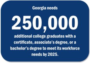 A career pathways program can also help Georgia strengthen its workforce and attract jobs. Georgia needs more workers with postsecondary credentials. More than 60 percent of Georgia’s jobs will require a certificate, associate’s degree or bachelor’s degree by 2025, according to the Governor’s Complete College Georgia initiative. Only 45 percent of the state’s young adults have one of those now and Georgia will need to produce an estimated 250,000 additional graduates beyond the expected graduation rate to meet its workforce needs. Educated adults will be crucial to Georgia’s 2025 workforce pipeline, according to the initiative.[18]