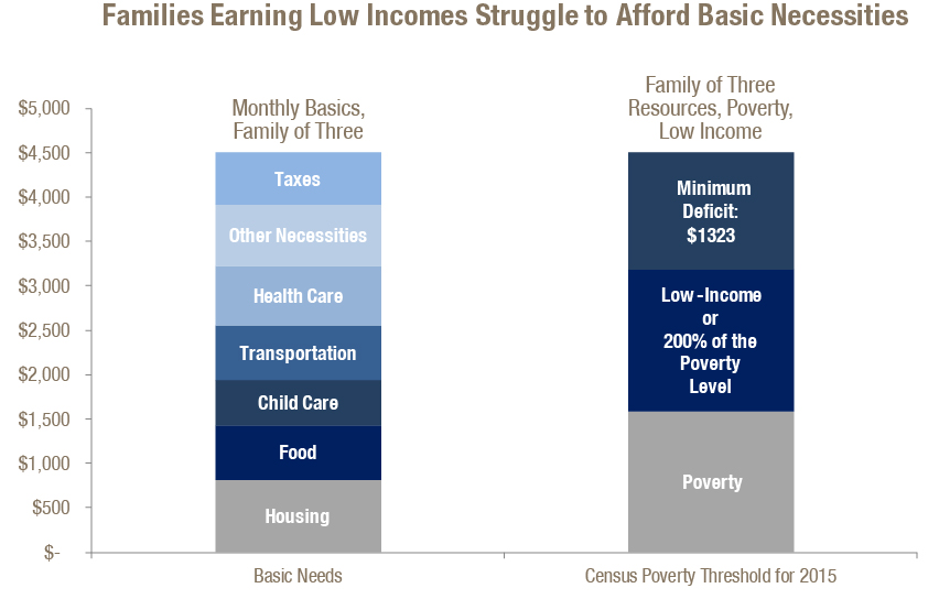 More than one in three of Georgia’s working families with children earn a low income. A low-income family of three earns less than $3,180 per month, or $1,323 less than what it takes to meet their basic needs in Gainesville, Ga. Parents who earn low incomes struggle to afford and sustain basic necessities for children, including adequate housing, food and clothing.
