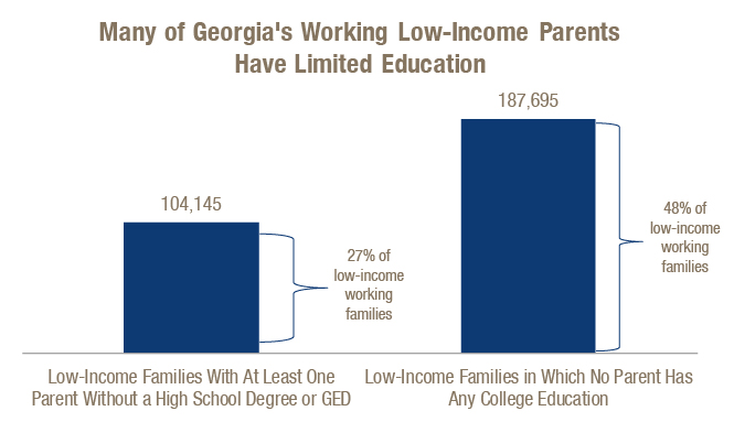 Many of Georgia’s working parents struggling with low incomes are trapped within their circumstances by limited education. In nearly 27 percent of Georgia’s low-income working families with children at least one parent lacks a high school diploma or its equivalent. And in nearly half of low-income working families, neither parent has education beyond high school.