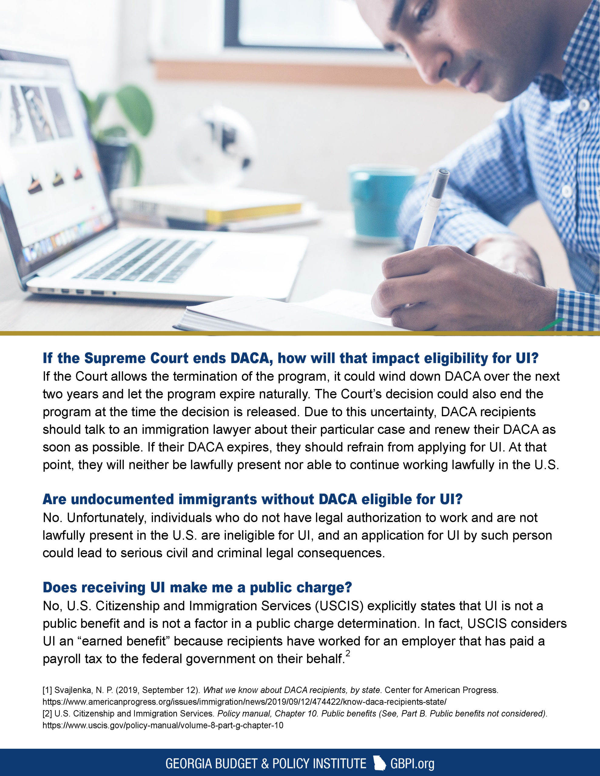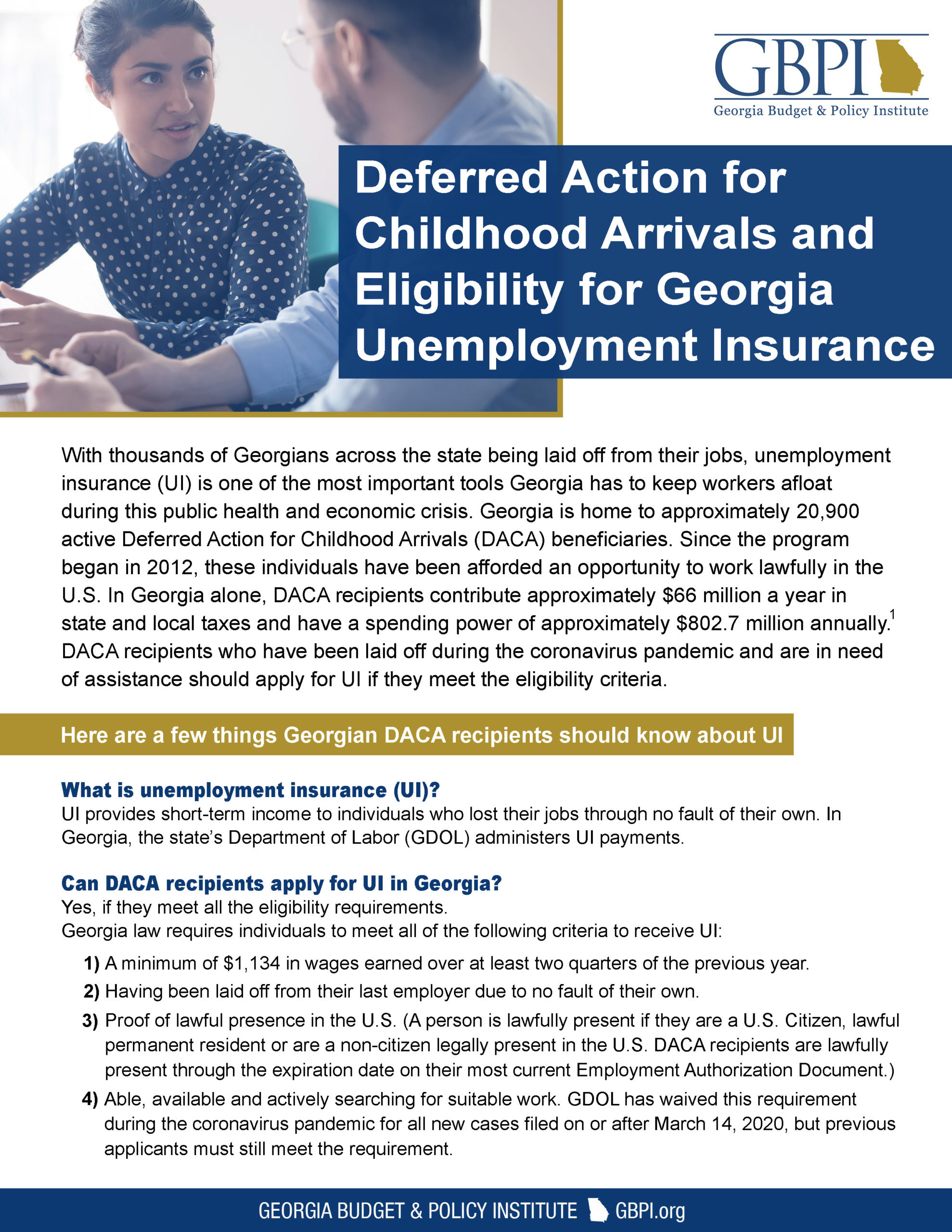 With thousands of Georgians across the state being laid off from their jobs, unemployment insurance (UI) is one of the most important tools Georgia has to keep workers afloat during this public health and economic crisis. Georgia is home to approximately 20,900 active Deferred Action for Childhood Arrivals (DACA) beneficiaries. Since the program began in 2012, these individuals have been afforded an opportunity to work lawfully in the U.S. In Georgia alone, DACA recipients contribute approximately $66 million a year in state and local taxes and have a spending power of approximately $802.7 million annually.[1] DACA recipients who have been laid off during the coronavirus pandemic and are in need of assistance should apply for UI if they meet the eligibility criteria.