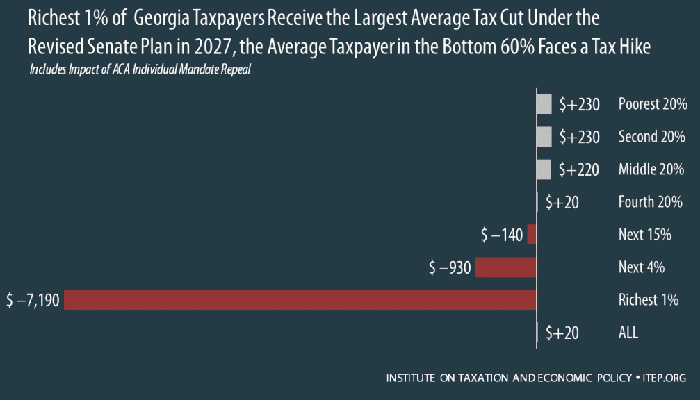 The U.S. Senate is set to vote as soon as this Thursday on a major tax package that poses serious risks to regular Georgia families and the state’s future prosperity. Bottom line, like its House counterpart, the current plan includes a massive corporate tax cut, a big new loophole for wealthy investors, a dramatic expansion of the national debt and changes to several tax deductions that could leave lots of middle class families paying more. It also includes a backdoor maneuver to undermine the federal health care law, which could add an estimated 13 million more Americans to the ranks of the uninsured.