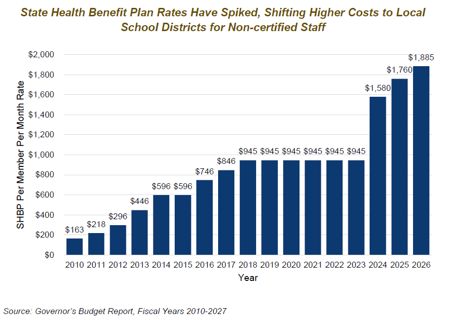 In FY 2027, the per member per month (PMPM) rate is set to increase by 8% from $1,885 to $2,028. Since 2010, annual district costs have increased from $1,952.64 per employee to $24,336 in FY 2027, a yearly increase of $22,383.[8] Local districts cover SHBP costs for 62,300 classified employees, along with an additional 4,900 locally paid certified employees for a total of 67,200 employees. In FY 2027, districts will pay an estimated $1.5 billion more in SHBP costs statewide due to the cumulative effect of cost increases passed on from the state since FY 2010.