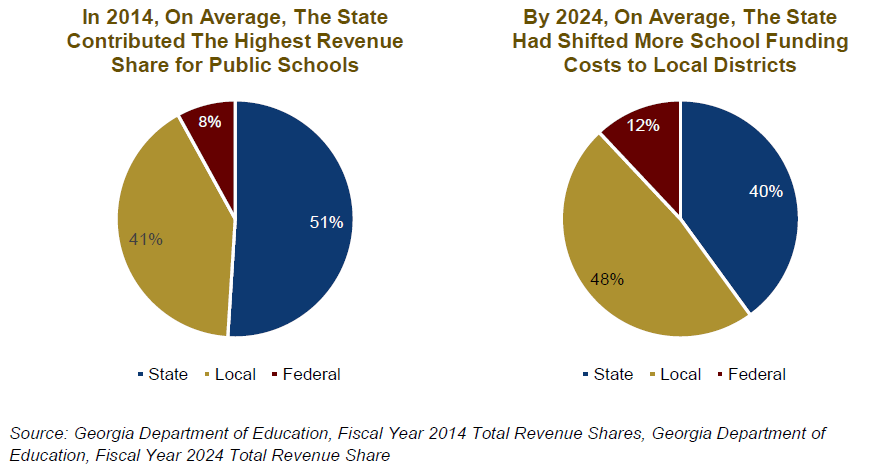 Local property taxes are critical for funding K-12 schools. In recent decades the state of Georgia has substantially reduced its funding commitments for local schools for health care costs, equalization and student transportation. These cost shifts to local districts have added upward pressure to property taxes because school districts have few other options to raise the revenues needed to educate students.