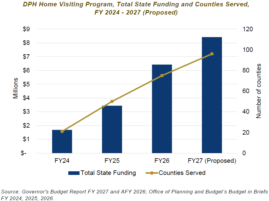 The proposed FY 2027 budget includes a $2 million increase to expand Georgia’s home visiting program that first launched in July 2023. Through this program, public health nurses and community health workers provide no cost, personalized care during and after pregnancy and to infants up to 1 year old in order to improve maternal and infant outcomes, particularly in rural counties with limited access to care and support.[3] The small proposed increase in state funds would allow the program to serve families in a total of 96 counties by leveraging $8.4 million in total state funds. The House’s Georgia Families First legislative initiative introduced in February 2026 goes beyond the Governor’s recommendation and would add $8.9M in FY27 state funds (for a cumulative total of $15.3M in state funds) to expand the program to 154 counties.[4]