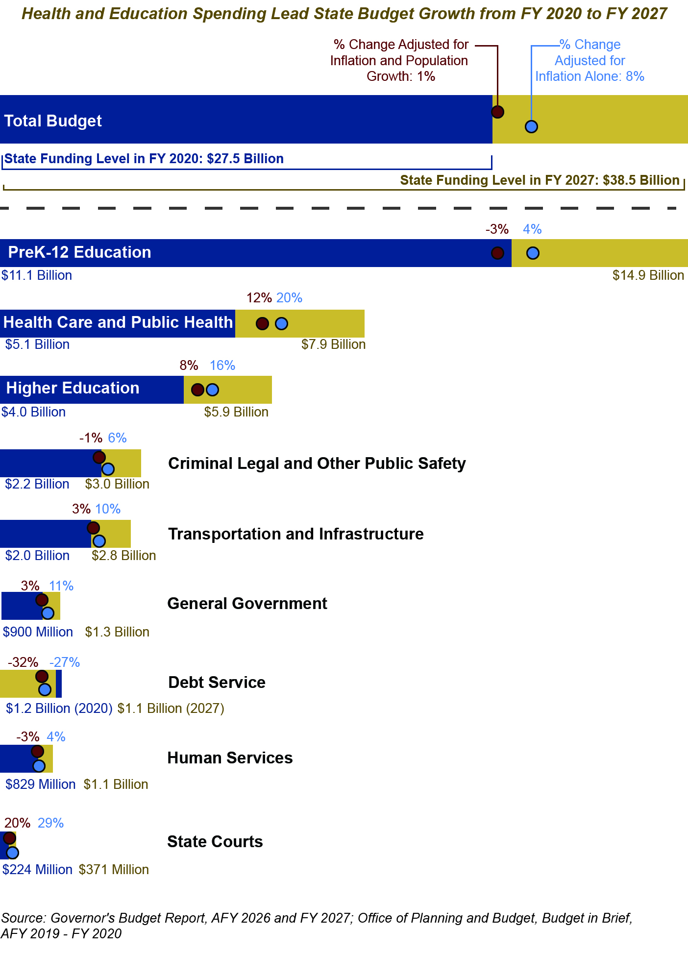 [1] Governor’s Office of Planning and Budget. (2026, January 20). State Residential Population, 2025-2060, average of 2026-2027 population; U.S. Bureau of Labor Statistics. (2026, January 20). Inflation Calculator, July 2007 to December 2025; Office of the Governor. (2026, January 15). Governor’s Budget Report, AFY 2026 and FY 2027; Office of Planning and Budget. (2019). Budget in Brief, AFY 2019 – FY 2020.