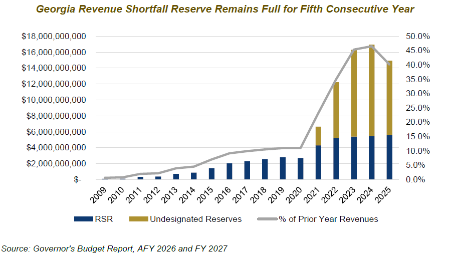 In FY 2025, after Georgia’s undesignated surplus reached a peak balance of $11.5 billion, lawmakers spent down $2.14 billion on a combination of infrastructure projects and one-time rebates. Gov. Kemp’s AFY 2026 proposal follows a similar formula and would reduce the balance of Georgia’s undesignated reserves down to $5.1 billion. Nevertheless, Georgia would also retain $5.6 billion in its RSR, which remains full at 15% of prior year revenue collections.