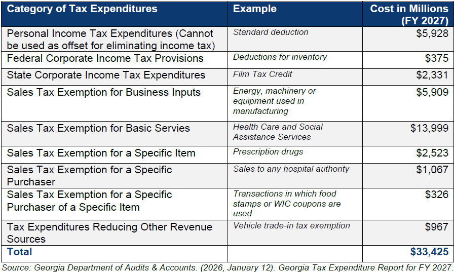 Importantly, the committee charged with formulating a plan to eliminate Georgia’s largest source of revenue did not name any potential sources of revenue to replace the more than $16 billion in personal income tax revenues that the state relies on to balance its budget. Each January, Georgia releases its annual Tax Expenditure Report, which estimates the cost of all state tax exemptions, exclusions, deductions and credits applied to state taxes. The following chart categorizes the $33.4 billion in total tax expenditures reported for FY 2027. This figure includes $5.9 billion in state personal income tax expenditures, which could not be used to raise revenue to help offset the costs of eliminating the personal income tax.