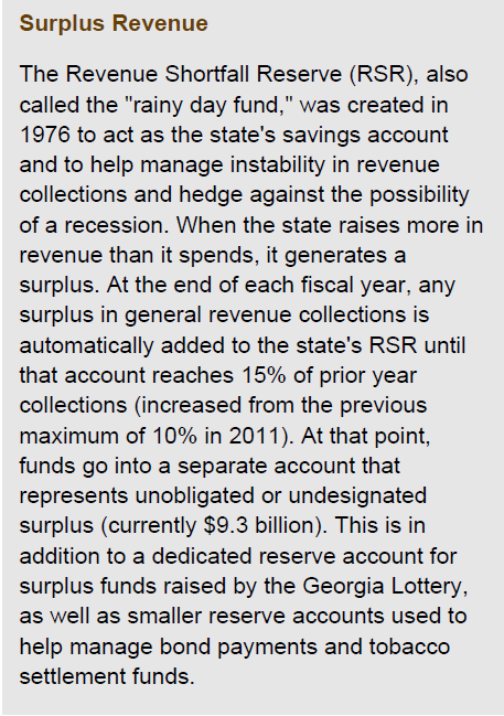 As shown above, prior to FY 2021 Georgia had never exceeded the 15% maximum threshold for the RSR. Even as state leaders consider the largest non-emergency spend-down of Georgia’s reserves in history, legislators can take comfort in the fact that Georgia’s reserves would remain well above historical norms at $10 billion. These resources are equivalent to the cost of operating state government for nearly five months. This leaves lawmakers considerable flexibility to continue considering ways to further leverage the state’s surplus such as by creating a dedicated Child Care Trust Fund or planning additional infusions into Georgia’s new need-based aid scholarship.