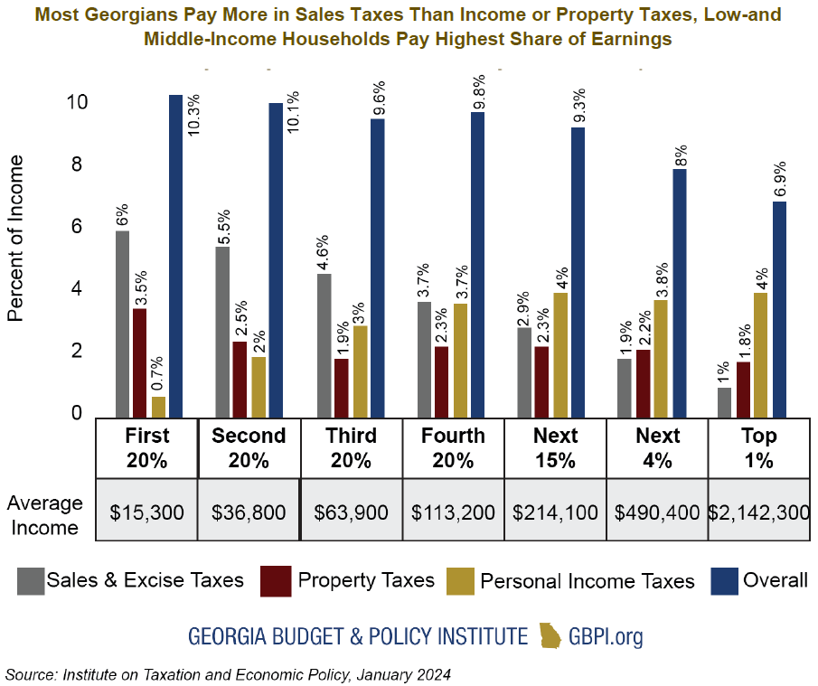 Entirely offsetting revenues lost from residential homesteaded property taxes would likely require doubling local sales tax revenues, which raised about $8.1 billion or 31% of local taxes statewide in 2023.[5] Currently, sales taxes average 7.42% statewide, split between a 4% state sales tax and combined local sales tax rates of up to 5%.[6] Regressive taxes push working and middle-income Georgians to pay a higher share of what they make in taxes. Although both property taxes and sales taxes are regressive, shifting from property taxes to sales taxes would likely cause low-to middle-income Georgians to pay an even higher share of what they earn in taxes.