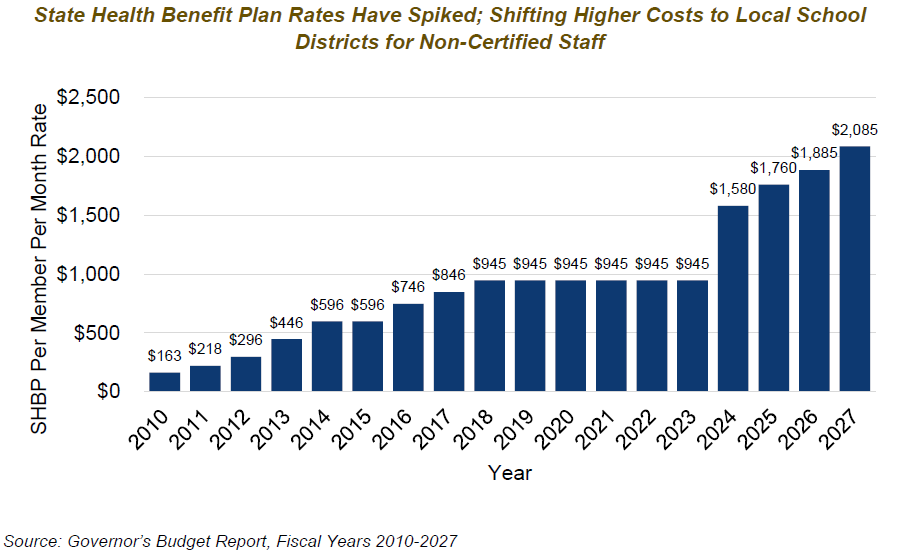 In FY 2023, the per member per month (PMPM) rate for non-certified staff spiked from $945 to $1,580 in FY 2024. This change alone has caused considerable financial stress for local districts. In FY 2027, the per member per month (PMPM) rate is set to increase even further, growing by 8% from $1,885 to $2,028. Overall, annual costs per employee have increased from $1,953 (FY 2010) to $24,336 (FY 2027). In total, school districts will pay $1.5 billion more for SHBP costs for their employees in FY 2027 due to cost increases since FY 2010.