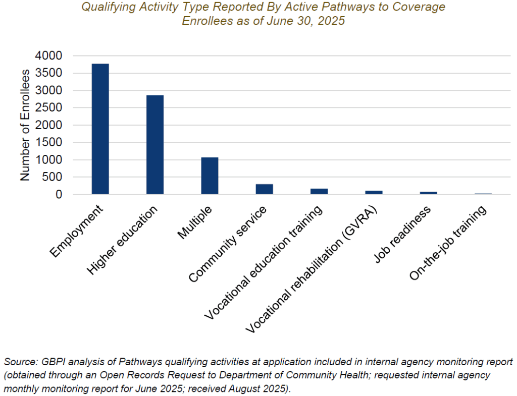 Among the over 8,000 Georgians who were eligible for the Pathways to Coverage program as of the end of June 2025, most qualified under employment (including self-employment) or enrollment in higher education. An additional 13% reported multiple qualifying activities, most of which were a combination of employment and higher education. About 5% qualified under a work program and 4% under community service.