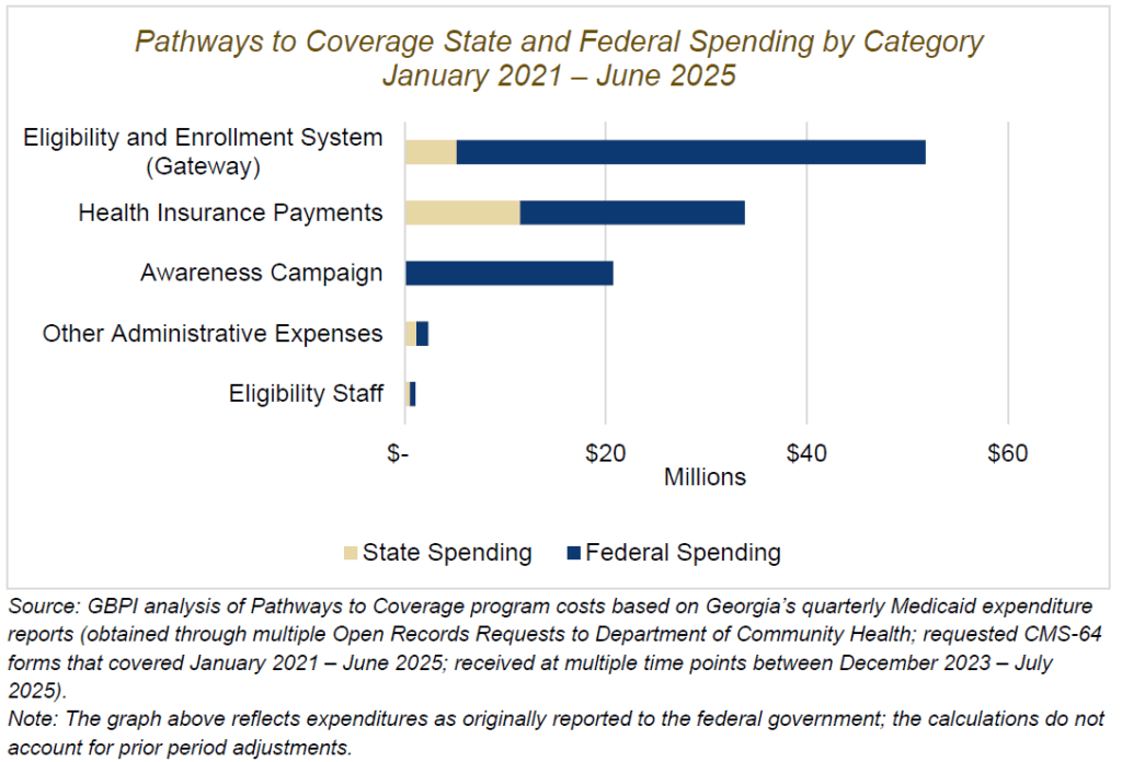 [15] GBPI analysis of Pathways to Coverage program costs based on Georgia’s quarterly Medicaid expenditure reports (Obtained through Open Records Requests to Department of Community Health; requested CMS-64 forms that covered January 2021 – June 2025; received at multiple time points December 2023 – July 2025).