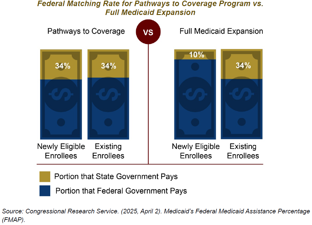 In its extension application, the state requested federal approval to run the Pathways to Coverage program through 2030.[24] However, the Centers for Medicare & Medicaid Services (CMS) provided only a temporary extension through December 31, 2026. The approval specifically cites H.R. 1 (formerly known as the One Big Beautiful Bill Act, or OBBBA) and the need to comply with the new federal provisions related to a Medicaid work and other qualifying activities requirement that goes into effect after December 31, 2026. [25]