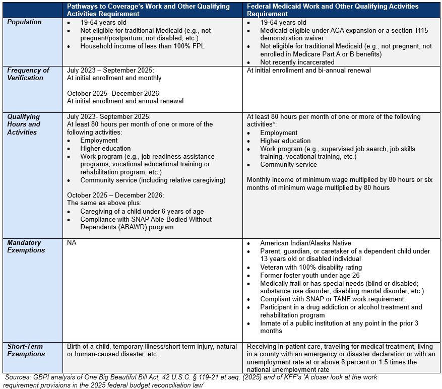 The Pathways to Coverage work and other qualifying activities reporting requirement has more restrictive criteria, but less frequent eligibility checks compared to the requirement created under the 2025 H.R. 1 budget reconciliation law.[26],[27]
