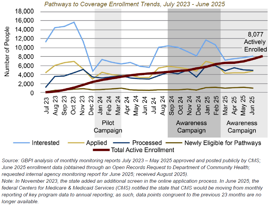 [9] Department of Community Health. Cumulative enrollment in the Pathways to Coverage Health Insurance Premium Payment (HIPP) program option. (Obtained through an Open Records Request; requested cumulative enrollment in the Pathways to Coverage Health Insurance Premium Payment program from January 1 2024 – June 30, 2025; received October 2025).