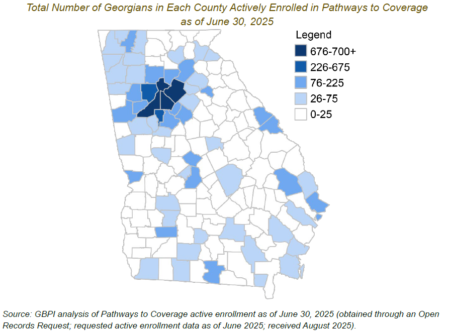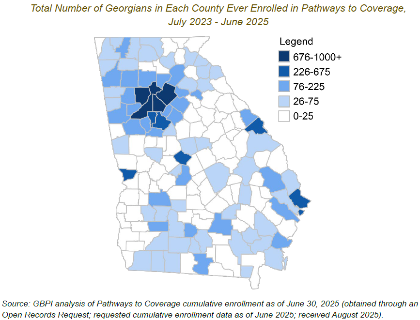 Almost half (48%) of Georgia’s counties still had 25 or fewer residents who had ever been covered under the Pathways to Coverage program after two years of enrollment.