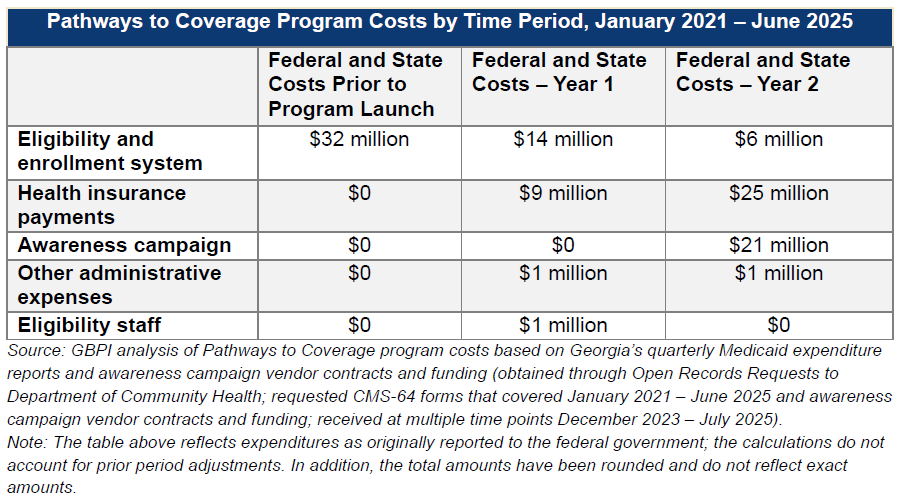 [17] GBPI analysis of Pathways to Coverage program costs based on Georgia’s quarterly Medicaid expenditure reports (Obtained through Open Records Requests to Department of Community Health; requested CMS-64 forms that covered January 2021 – June 2025; received at multiple time points December 2023 – July 2025).