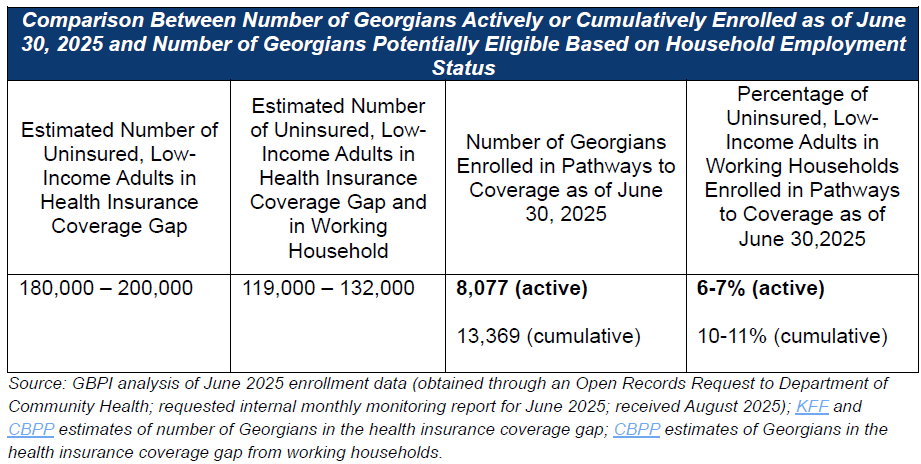 - About 8,077 Georgians were actively enrolled in the Pathways to Coverage program by the end of the first two years, which represents no more than 7% of uninsured, low-income adults from working households.