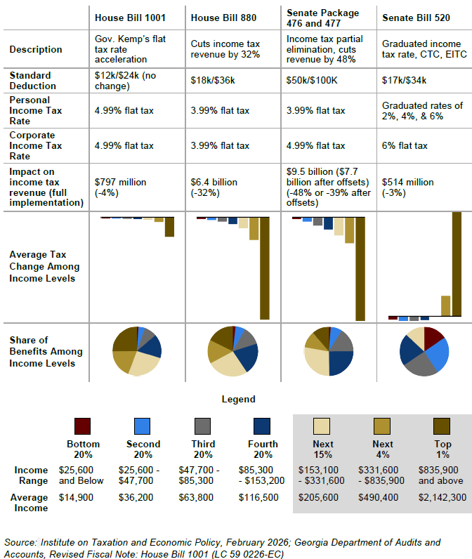 During the 2026 legislative session, members of the General Assembly have moved several bills forward that would dramatically change how Georgia raises and budgets public funds. Gov. Kemp has proposed accelerating the multi-year tax cut legislation enacted during his first term to reach a flat personal and corporate income tax rate of 4.99%. Other state leaders have proposed fully eliminating or significantly scaling back the income tax, Georgia’s largest source of revenue.