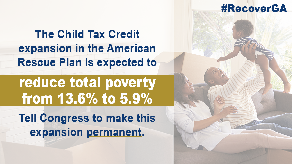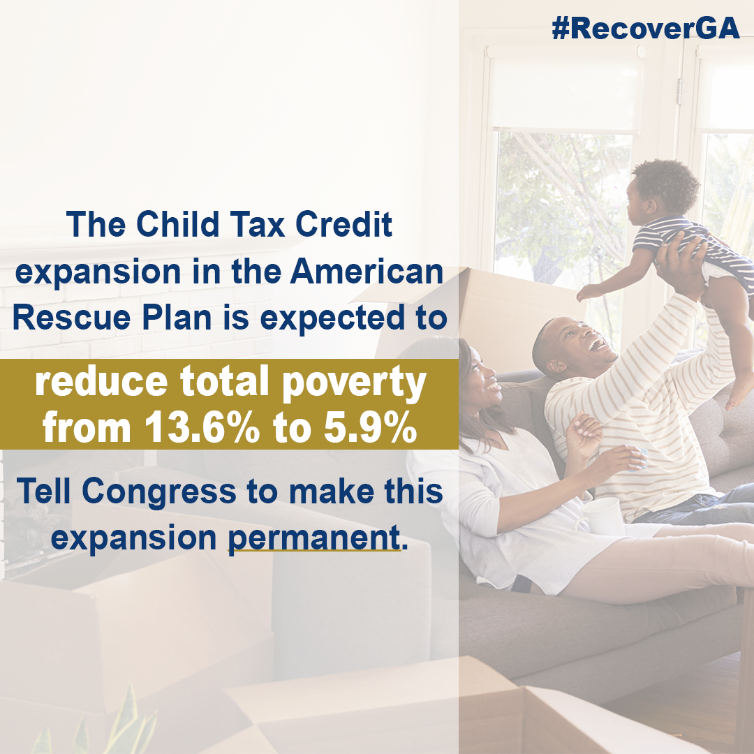- Georgia has an estimated 500,000 children living in poverty, with families across the state struggling to make ends meet. Making permanent the American Rescue Plan’s temporary expansions of the Earned Income Tax Credit and Child Tax Credit can raise incomes, help Georgia families achieve financial security and strengthen our safety net. Tell your lawmaker to support making these recovery solutions permanent: https://bit.ly/3hDFSmQ #RecoverGA