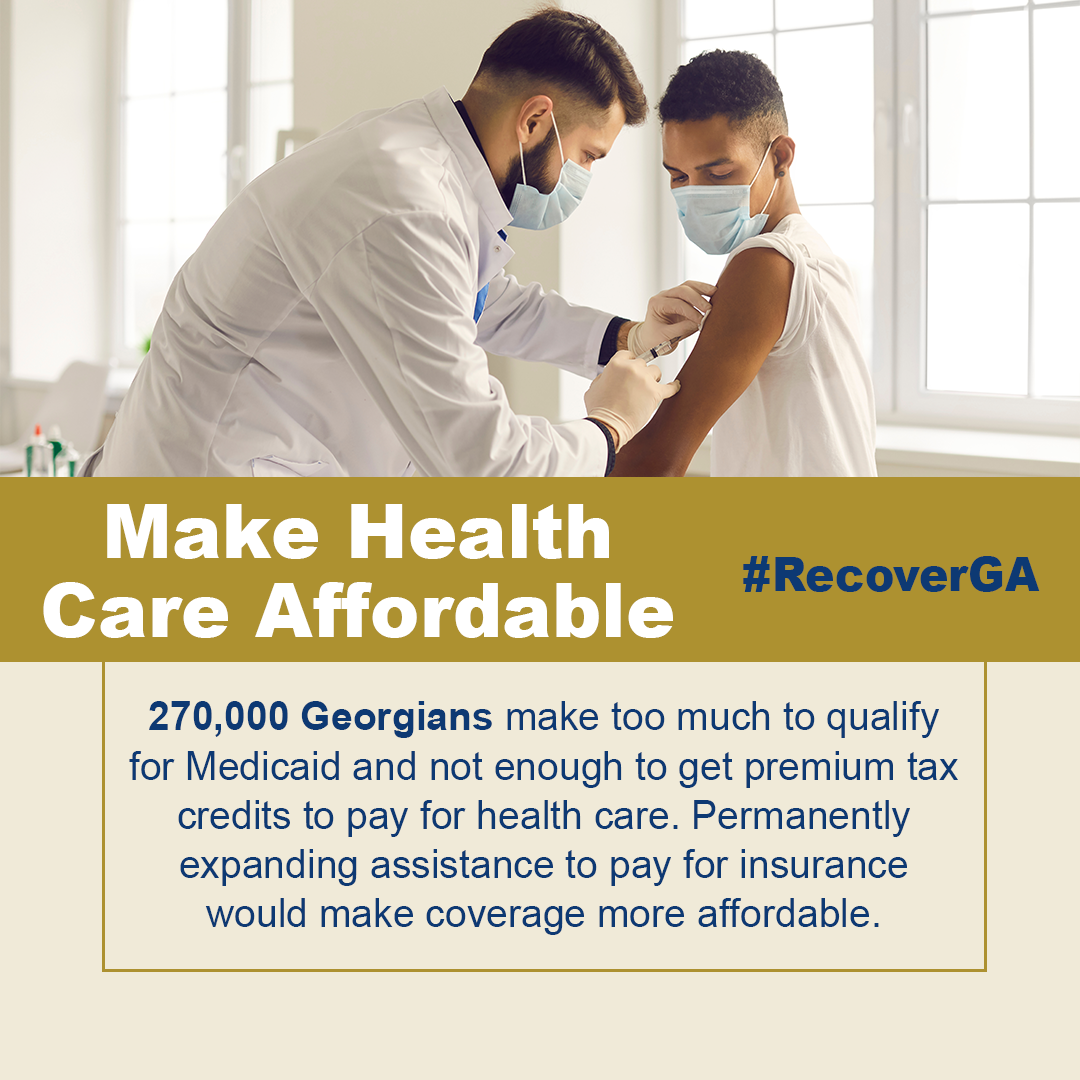 - Expand health coverage and make it more affordable. They can do this by closing the Medicaid coverage gap for the 270,000 Georgians who make too much to qualify for Medicaid and not enough to get premium tax credits on healthcare.gov and making permanent the American Rescue Plan’s premium tax credit expansions, which help make coverage more affordable for people who buy insurance on their own.