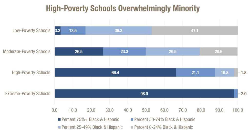 Schools where the majority of students are low-income are also the schools with the most black and Hispanic students. Nearly all of the students in extreme poverty schools are black or Hispanic. Too often these schools are in communities whose members have long faced barriers to well-paying jobs, postsecondary institutions, healthcare, safe and affordable housing, and other resources that build the pathway to economic opportunity.